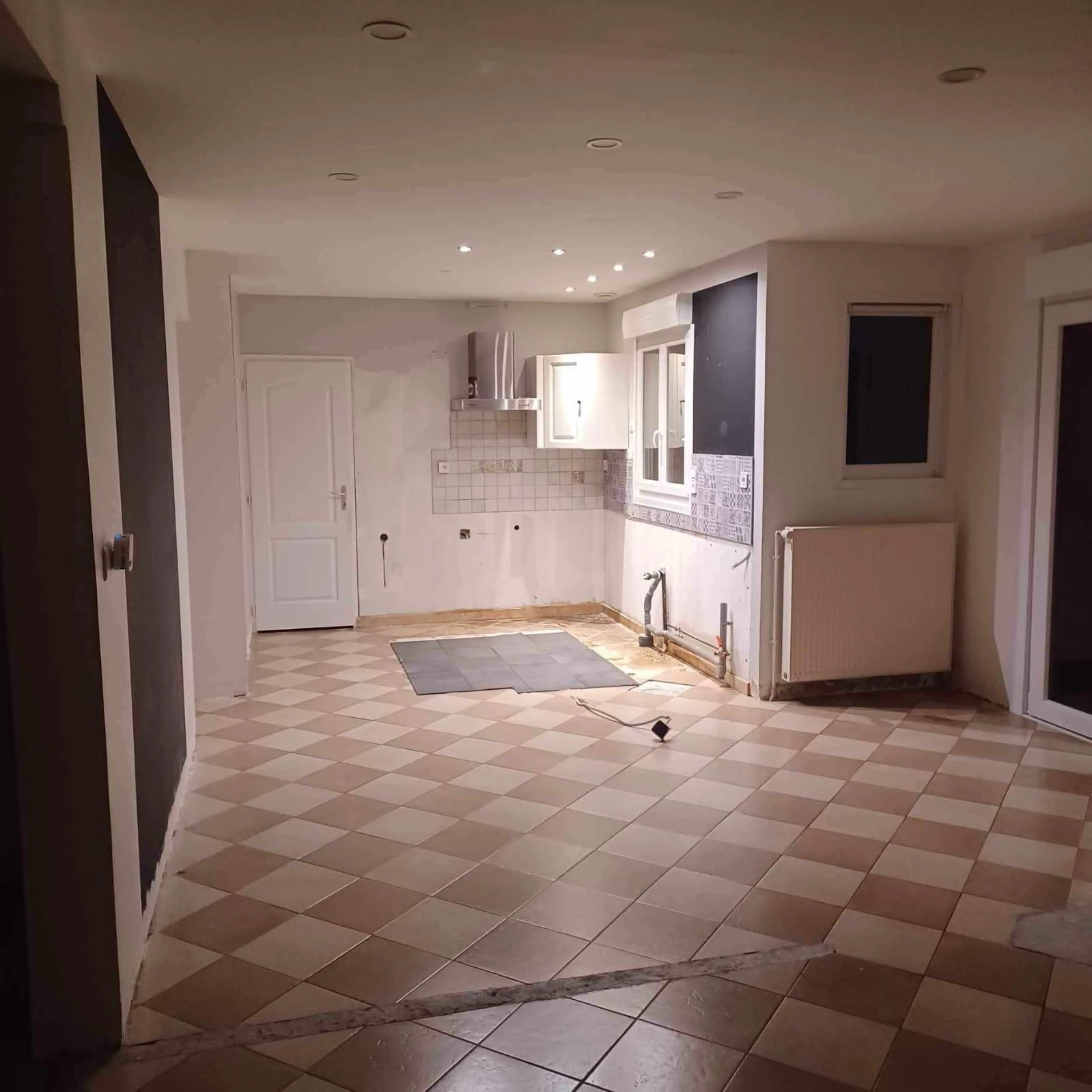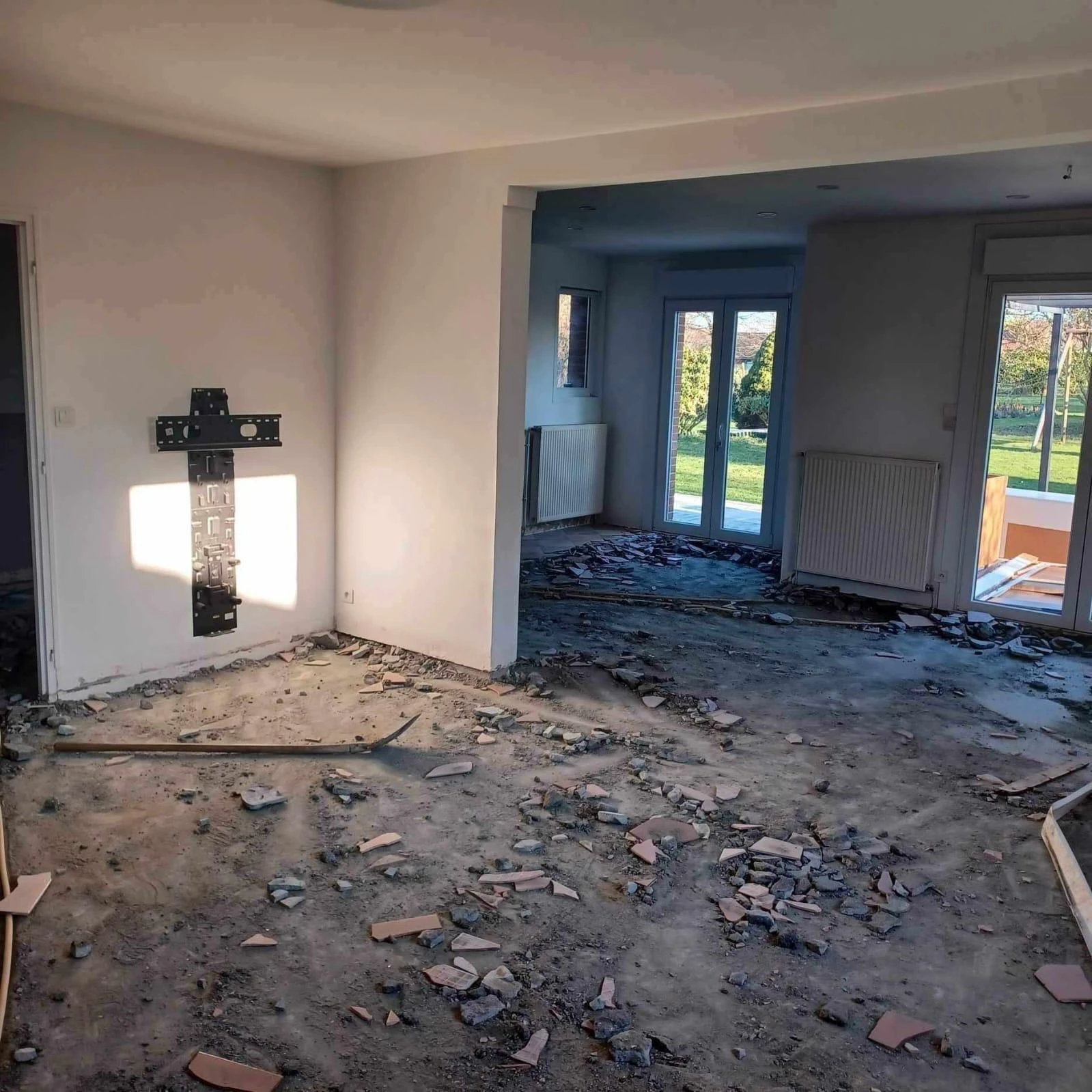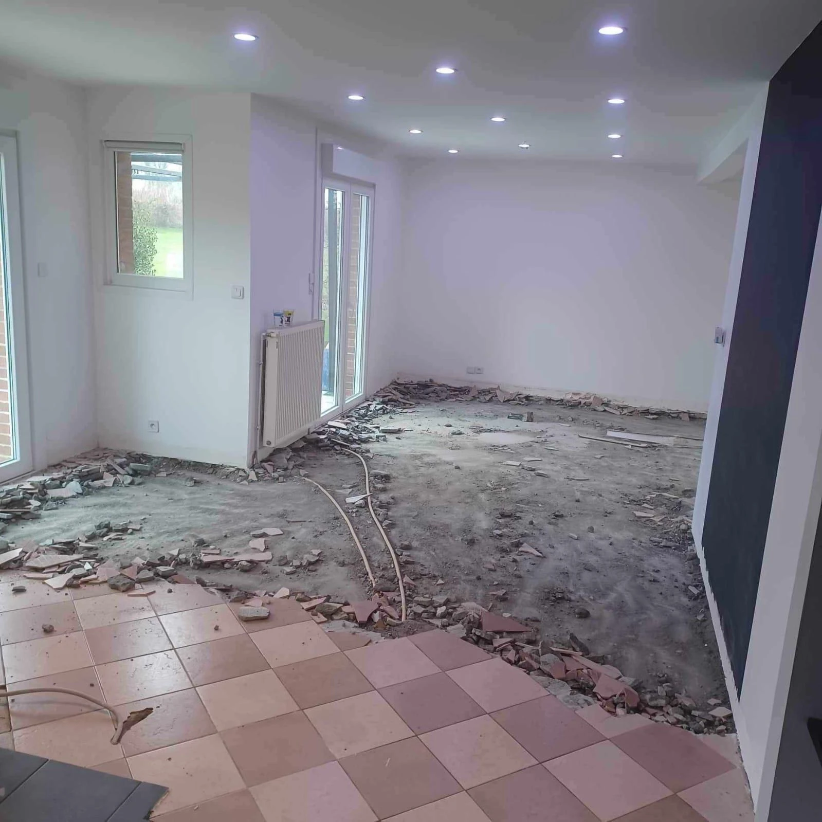Nous réalisons des travaux complets de rénovation de sol intérieur, comprenant la dépose de l’ancien carrelage afin de retrouver la dalle béton d’origine, garantissant une base saine et stable pour la suite des travaux.