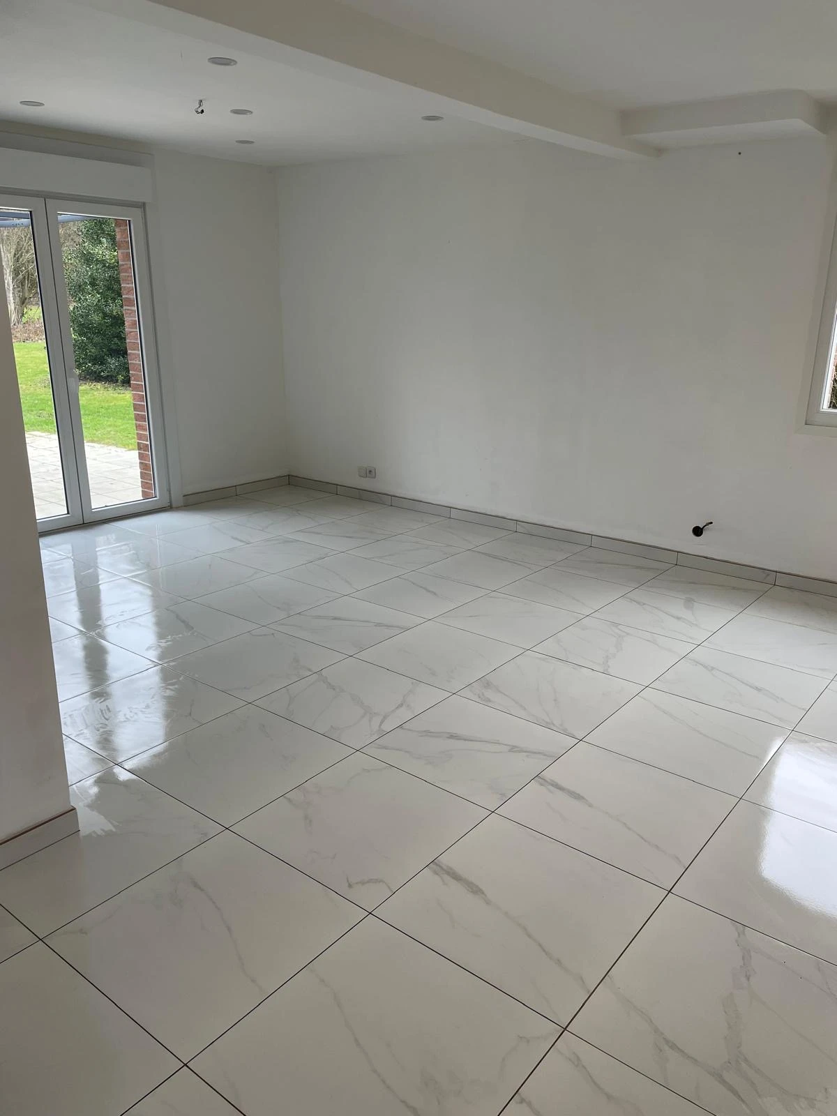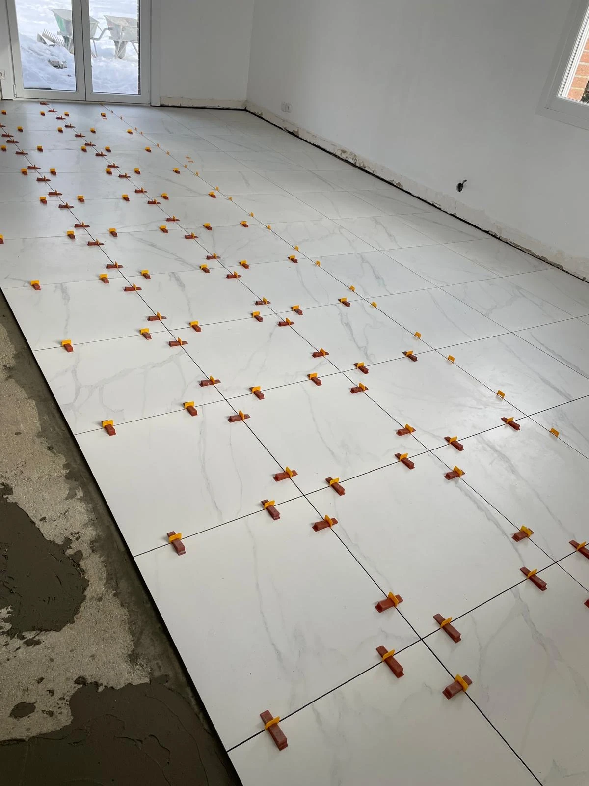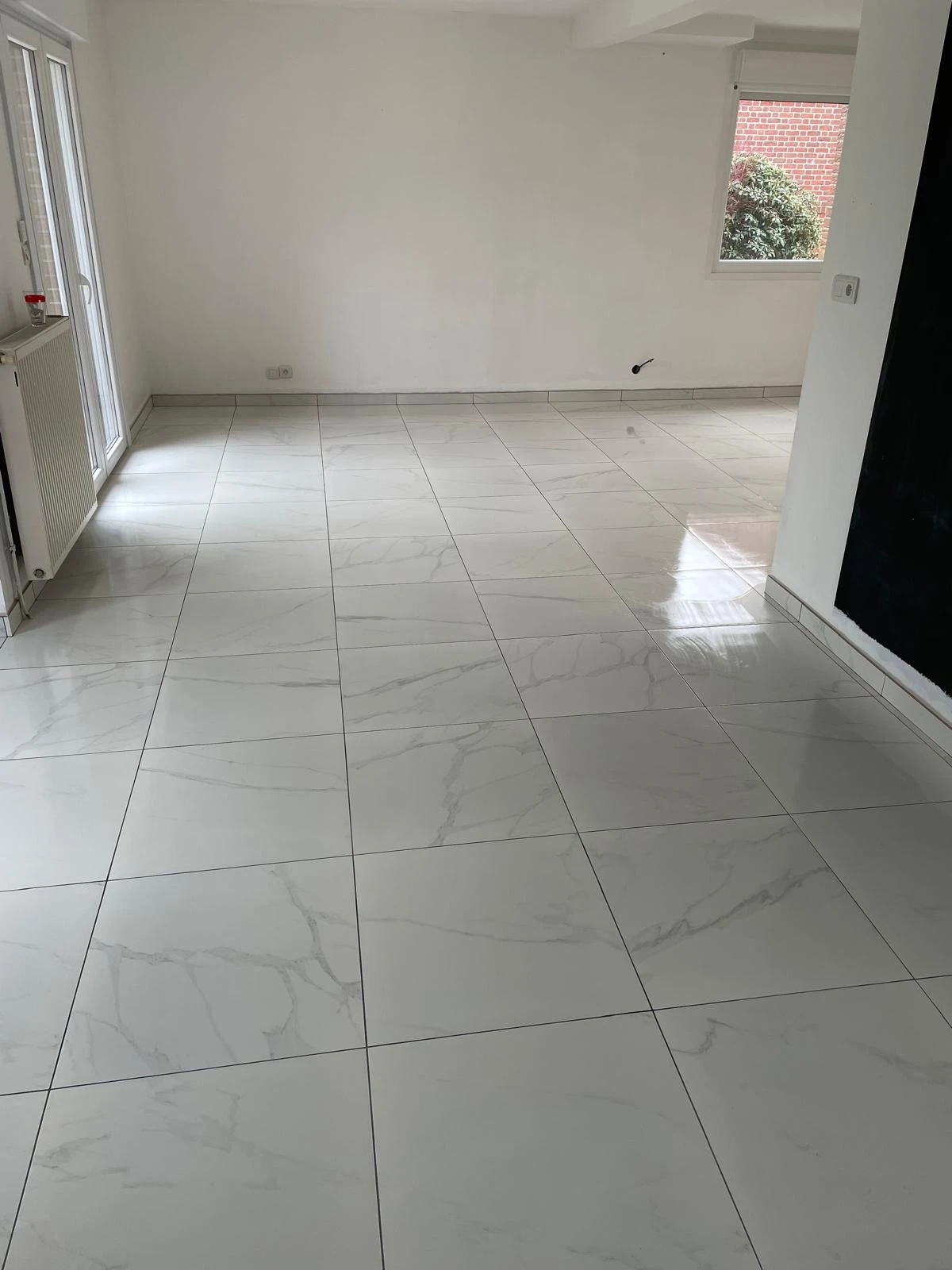 La pose du carrelage 60x60 est effectuée sur toute la surface avec les produits et techniques adaptés, garantissant une excellente planéité.