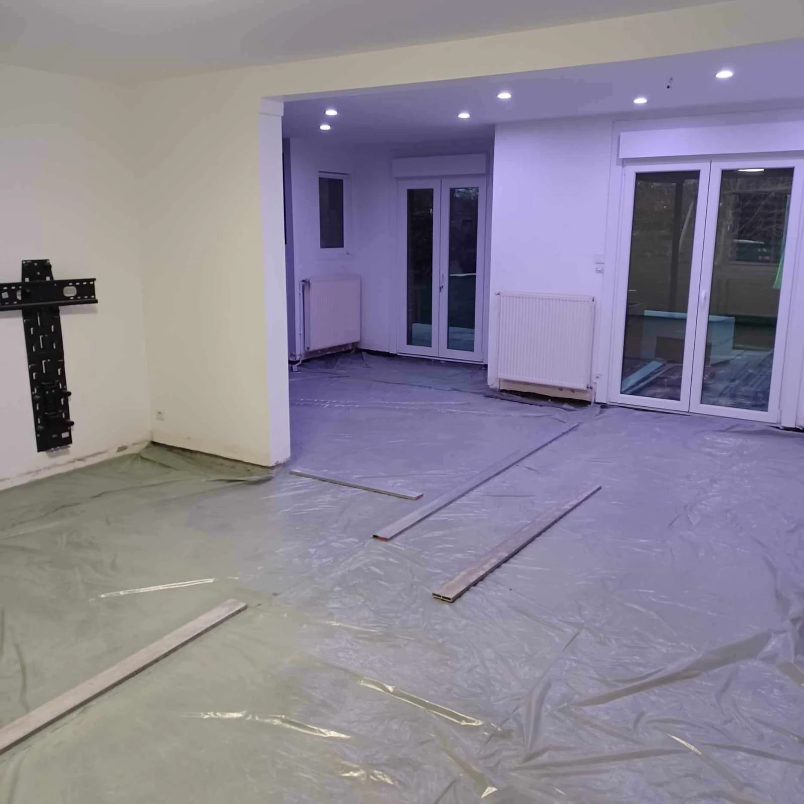 Les matériaux déposés sont évacués par camion benne, puis un film polyane est posé sur l’ensemble de la surface avant la mise en œuvre de la chape.